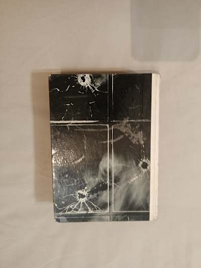 Its dark cover stood out starkly against the white tablecloth.
